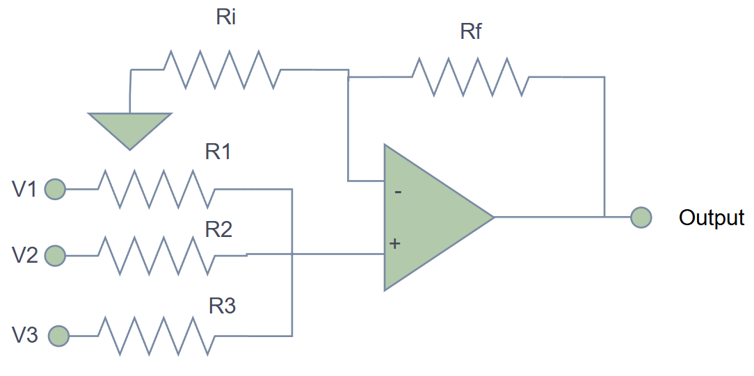 Vout=โˆ’Rf(V1R1+V2R2+V3R3)V_{out} = -R_f \left( \frac{V_1}{R_1} + \frac{V_2}{R_2} + \frac{V_3}{R_3} \right)