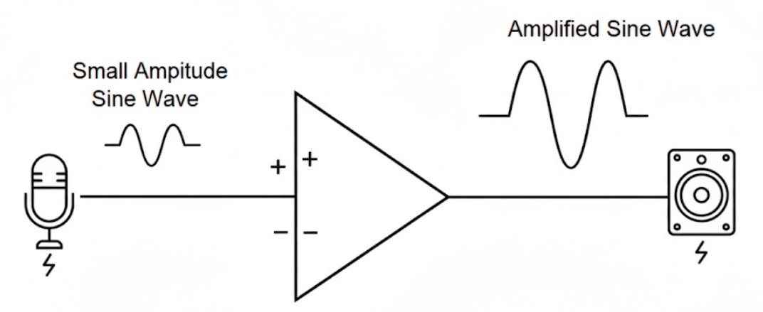 Imagine a whisper that needs to be heard in a large stadium β an amplifier takes that weak whisper and makes it strong without changing its shape, only its size.