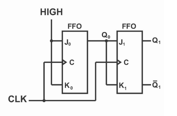 • FF1 toggles on every FF0 falling edge (Q0: 1→0 transition)